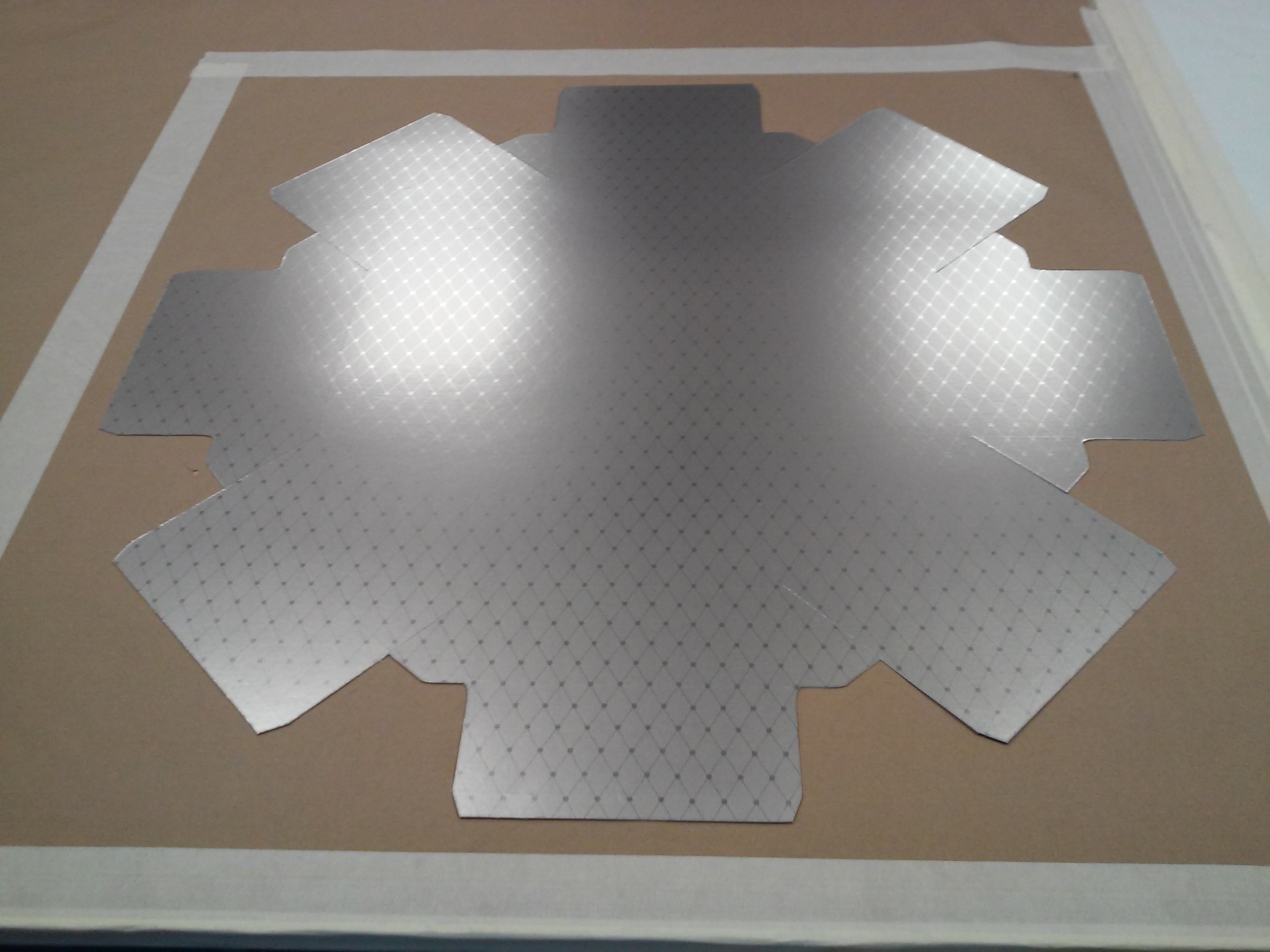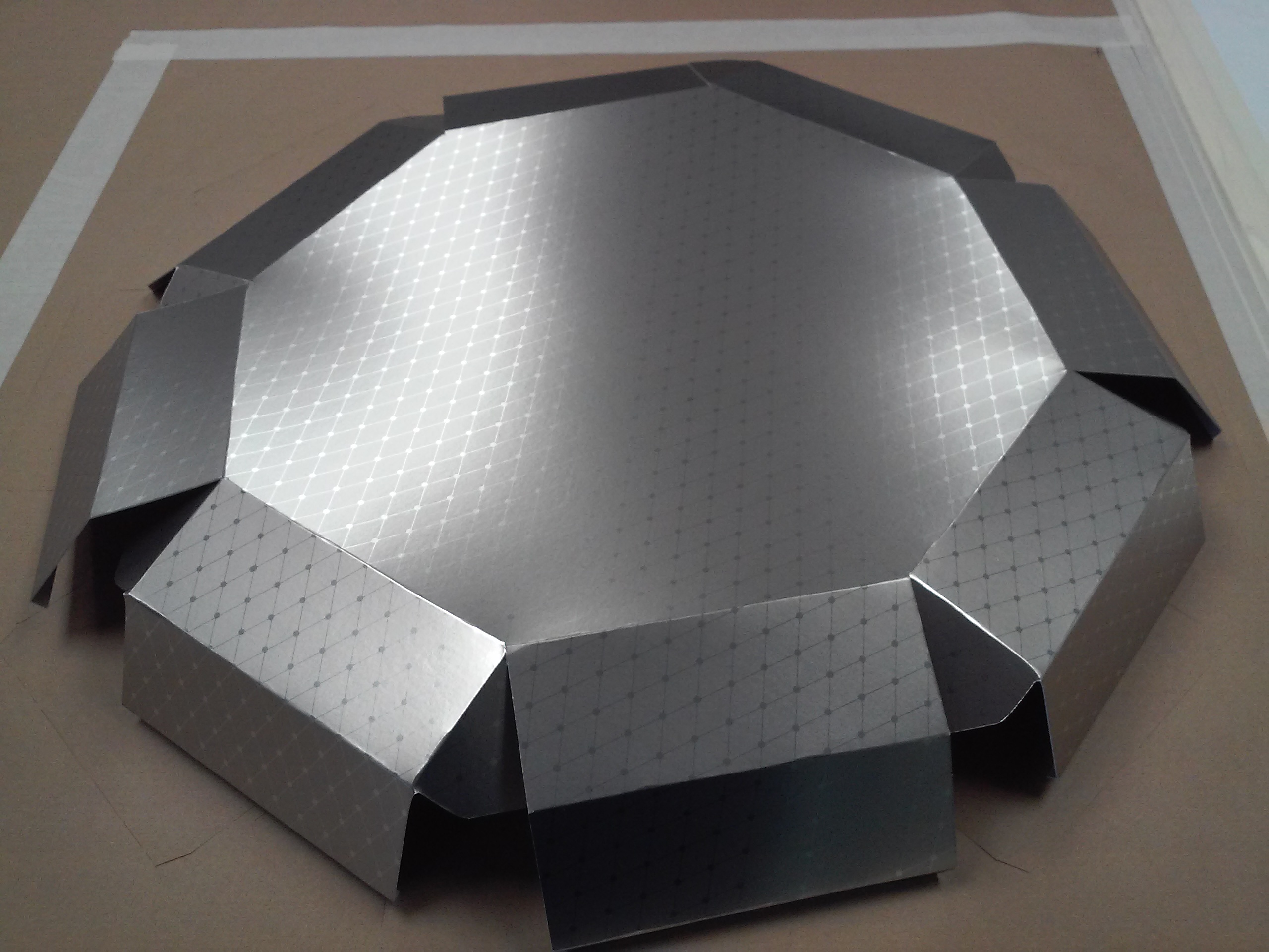 Paperboard octagonal box half. Folded (temporarily) to test assembly.