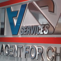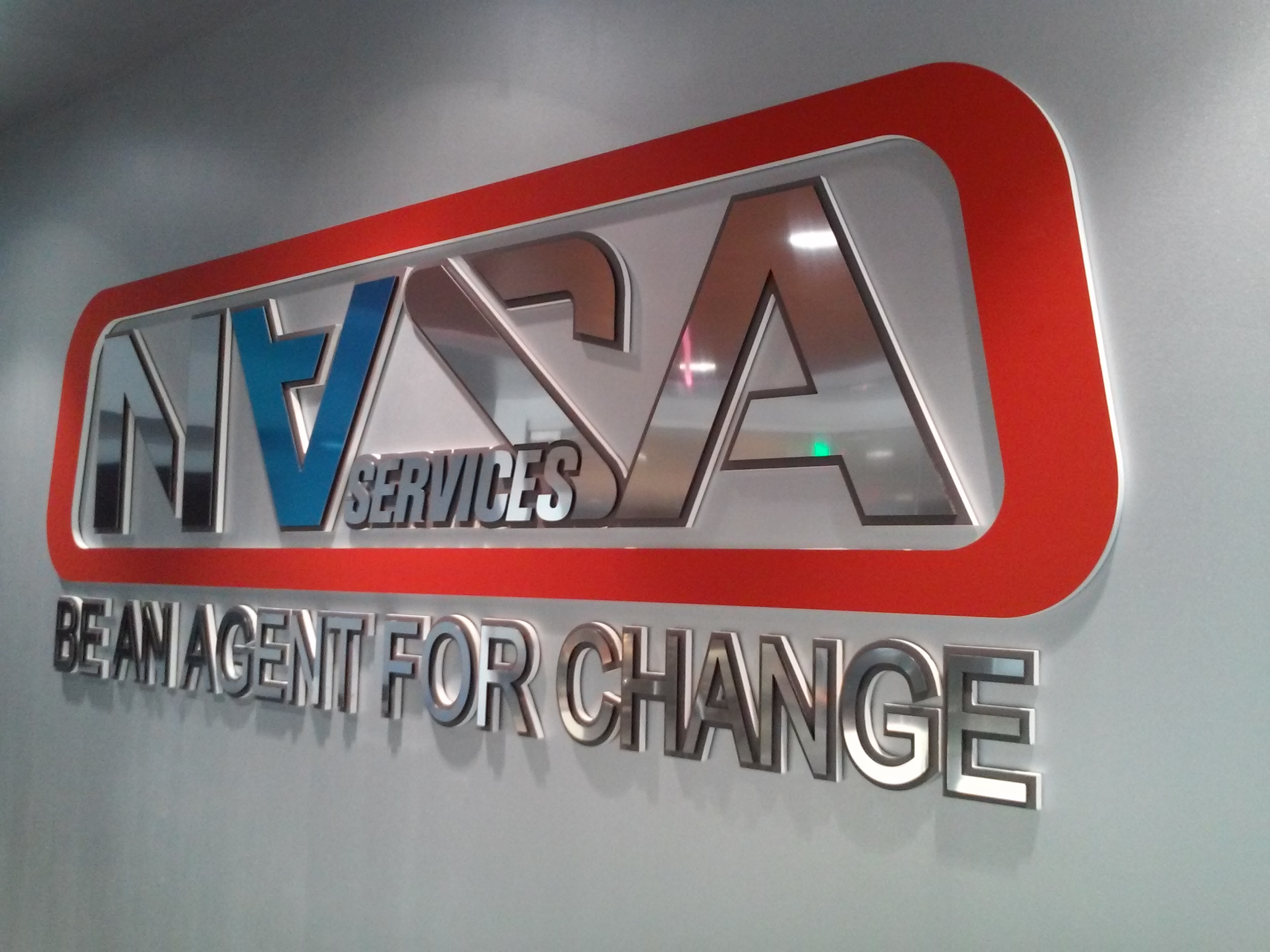 NASA Services, Montebello, CA. 1/4" silver-on-black alumaplast with 1/4" printed PVC backer outline, clear vinyl printed blue A. 1/2" PVC printed red.