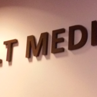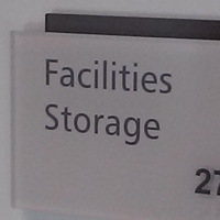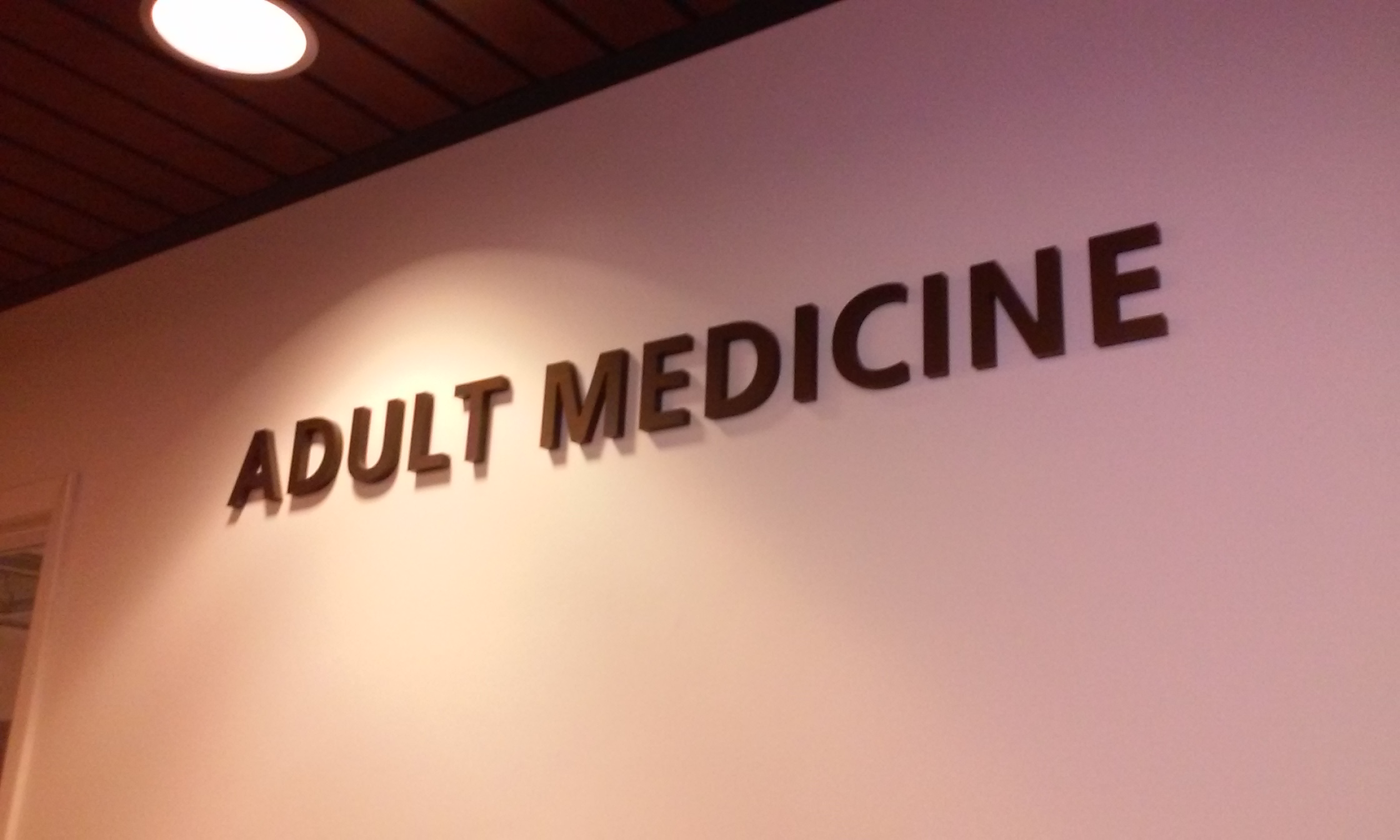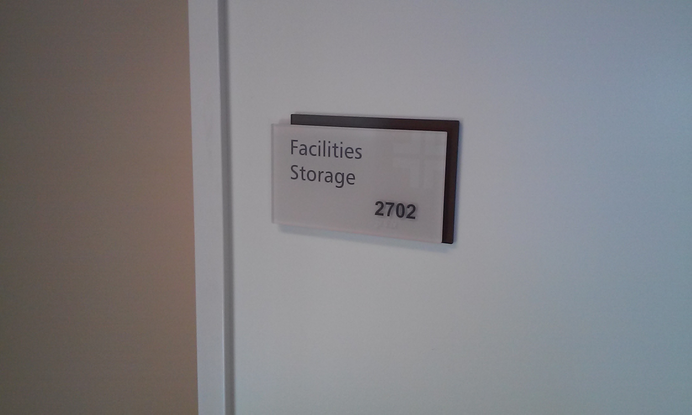 Facey Medical, Valencia, CA. 1/8" double-layered acrylic, front printed plus ADA letters, back painted metallic bronze.