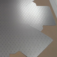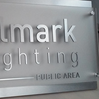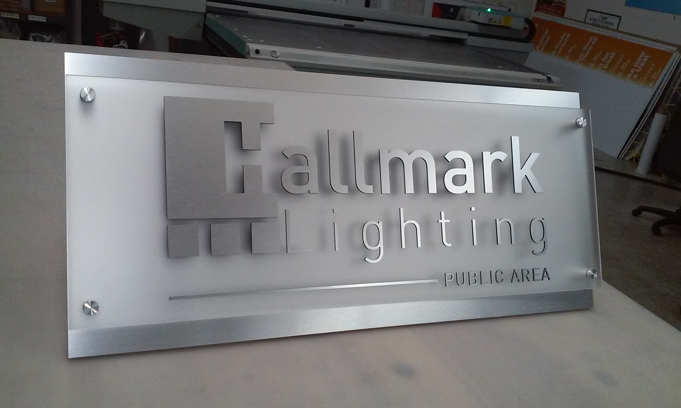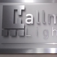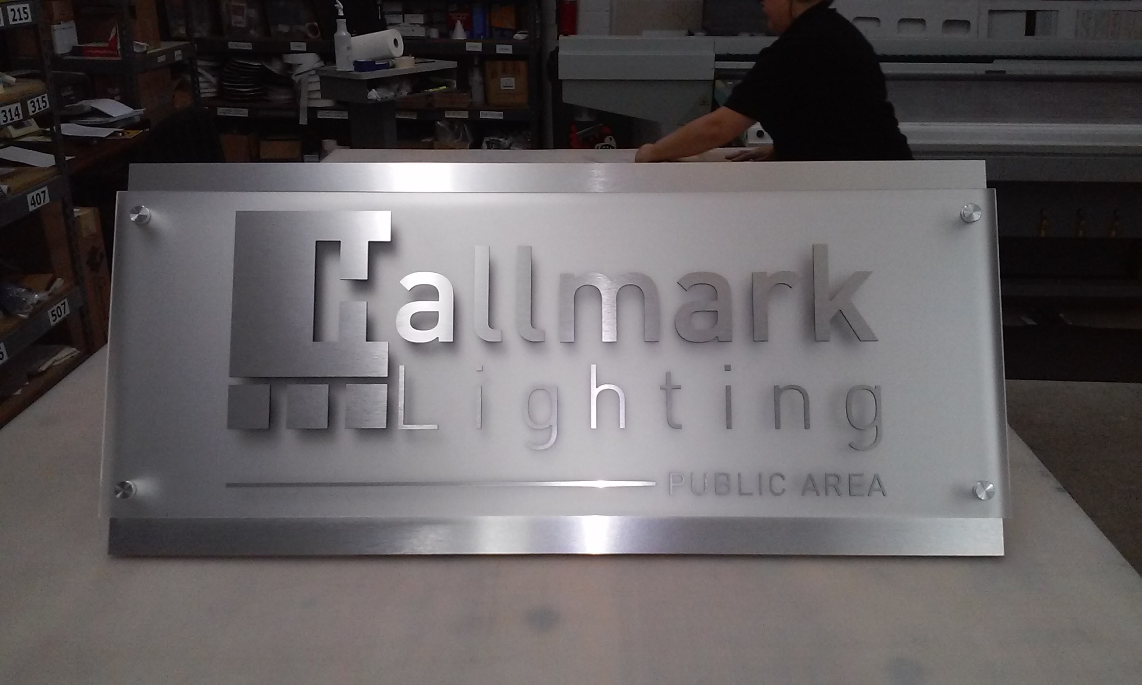 Hallmark Lighting, Chatsworth, CA. 1/8" brushed silver-on-black alumaplast on 1/4" clear frosted acrylic, in front of 1/4" alumaplast base.