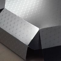 Paperboard octagonal box half. First cut, then flipped for creasing. I designed and made the creasing drag tool for this machine, which did not have tangential spindle control.